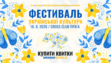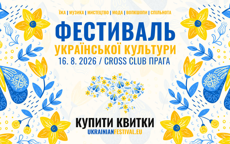 Щиро запрошуємо вас на третій ФЕСТИВАЛЬ УКРАЇНСЬКОЇ КУЛЬТУРИ 🇺🇦, який відбудеться у неділю 16 серпня 11:00 - 21:00 перед клубом Cross в Празі ⚙️.